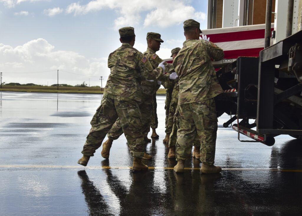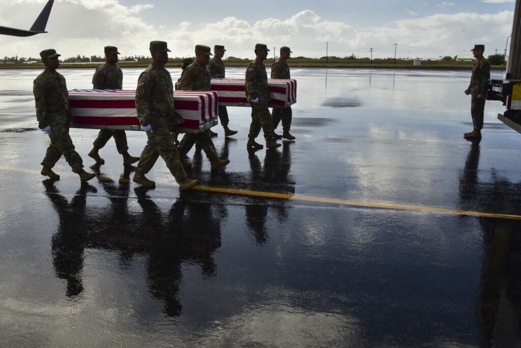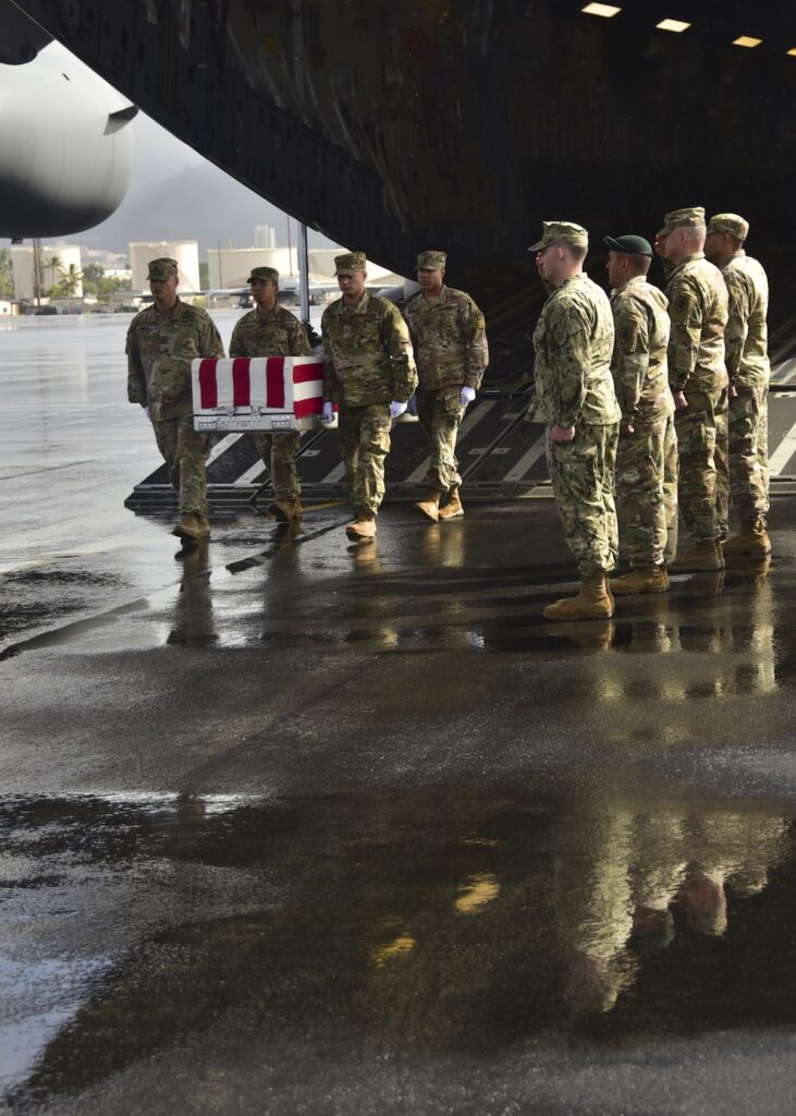 Caption: Members of the Defense POW/MIA Accounting Agency (DPAA) conduct an honorable carry for the remains of unidentified U.S. service members at Joint Base Pearl Harbor-Hickam, Hawaii, Jan. 30, 2019. The remains were recently disinterred from graves at the Manila American Cemetery and Memorial in the Philippines as part of DPAA’s effort to provide the fullest possible accounting of our missing personnel to their families and the nation. (all U.S. Air Force photos by Staff Sgt. Apryl Hall)
